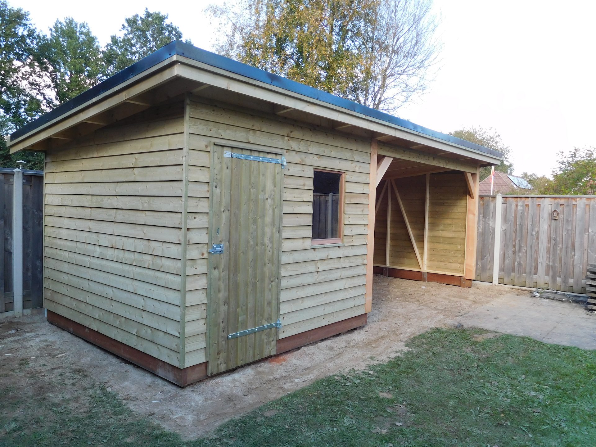 Voor een klant in Gieten bouwden wij een praktische combinatie van berging en overkapping. De compacte constructie is slim ingedeeld: een afgesloten berging met raam en deur aan de voorzijde, gecombineerd met een ruime overkapping aan de zijkant. Het geheel is afgewerkt in naturel hout en voorzien van stevige hoekpalen. De overkapping biedt voldoende ruimte voor zitmeubilair of tuinopslag. Een ideale oplossing voor wie op zoek is naar multifunctioneel gebruik van beperkte tuinruimte.